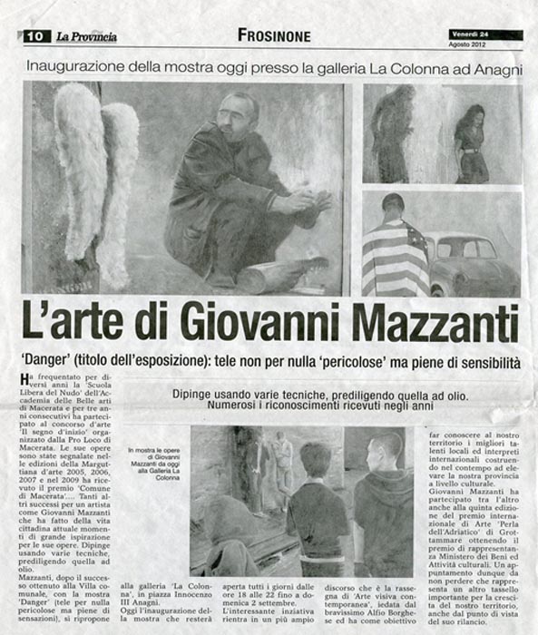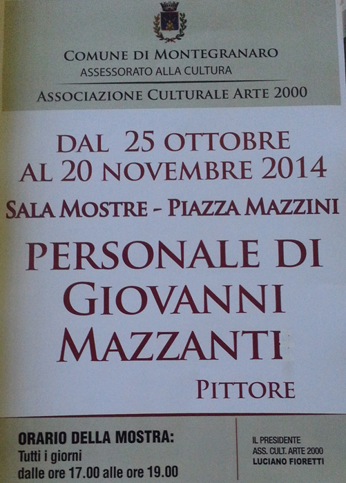 Presso la Sala Mostre in Piazza Mazzini del Comune di Montegranaro dal 25 Ottobre al 20 Novembre saranno esposte le mie Opere. La mostra è aperta tutti i giorni dalle ore 17.00 alle ore 19.00. Partecipate numerosi. |